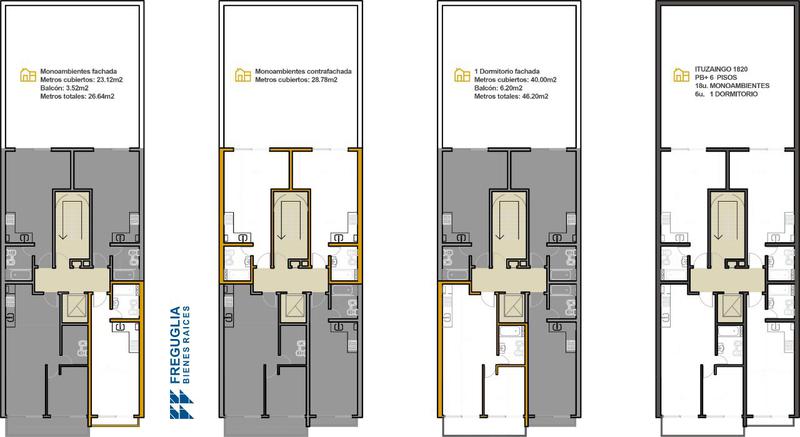 son monoambientes y uno de un dormitorio. A su vez existen un espacio de circulación común