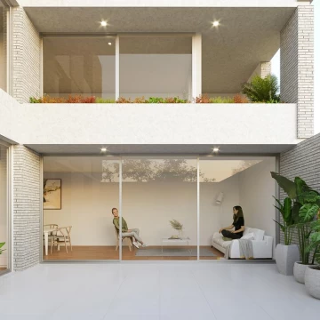 El proyecto se concibe como una caja de ladrillos grises que se perfora con la horizontalidad de las losas en todo su perímetro, y se extienden al este, para dar lugar a amplios balcones que actúan como espacio intermedio entre la vivienda y la ciudad.